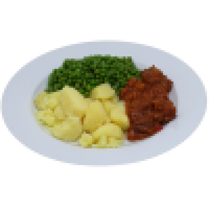 Gestoofde stukjes mals rundvlees in een romige Stroganoffsaus van tomaat, paprika, champignons en wodka, geserveerd met doperwten en kruimige aardappelen.