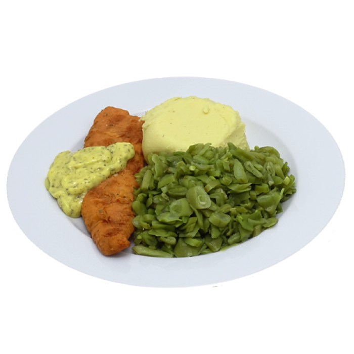Door beslag gehaalde en gefrituurde witvisfilet (MSC verantwoord gevangen) met een koude remouladesaus van mayonaise, stukjes augurk, ui, kappertjes en tuinkruiden, snijboontjes en een zachte puree van verse aardappel.