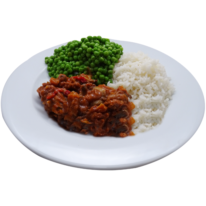 Hongaarse rundergoulash met doperwten en witte rijst (zoutarm/natriumarm).